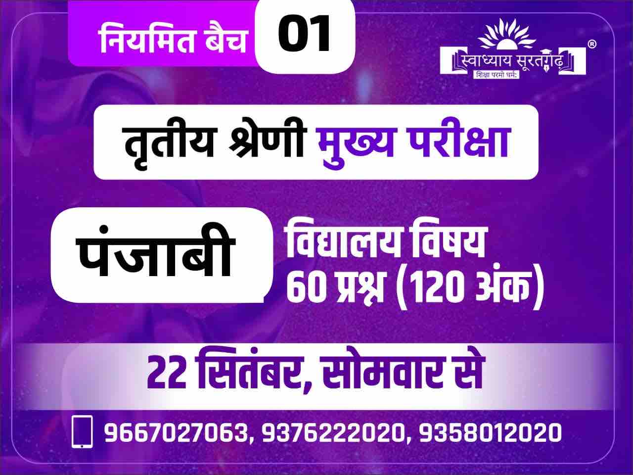3rd Grade Punjabi New Batch Start ऑनलाइन कोर्स में आपसे जो फीस ली जाएगी वह सिर्फ एक दौहरान यानी एक रिवीजन लगभग 90 दिन की शुल्क ली जाएगी। इस दौहरान(revision) में जो पेपर/PAPER आपको उपलब्ध करवाए जाएंगे उन सभी पेपर की वैधता (validity) लगभग 1 साल (365 day) से अधिक रखी जाएगी। *नियमित छोटे टेस्ट Test Folder तथा मेजर टेस्ट(RPSC पेटर्न पर) Content Section के Test Folder मे उपलब्ध होगा | *टेस्ट का पूर्ण शेड्यूल Overview सेक्शन में उपलब्ध *टेस्ट 7.00 PM निश्चित समय पर Content Section के Test Folder में अपलोड किया जाता है | *1 सप्ताह में 3 यूनिट टेस्ट रहेंगे प्रत्येक यूनिट टेस्ट में लगभग 50 प्रश्न सम्मिलित रहेंगे। प्रश्नों का स्वरूप वस्तुनिष्ठ प्रकार का होगा। **ऑनलाइन में हमने विद्यार्थियों को तीन सुविधाएं उपलब्ध करवाई है।** ➡️ 1. जिसमें आप फोन में ऑनलाइन MCQ अभ्यास कर सकते हैं(बार - बार)। ➡️ 2. आपको पेपर की पीडीएफ उपलब्ध करवाई जाएगी। जिसका आप प्रिंट निकाल सकते हैं अपने फोन में उसको Store कर सकते हैं। ➡️ 3. आपको पेपर की उत्तर कुंजी/ Answer key उपलब्ध करवाई जाएगी जिसका प्रिंट निकलवा सकते हैं और फोन में उसको store कर सकते हैं। *शेड्यूल प्लान में प्रत्येक विषय के टॉपिक दिए गए हैं आप विद्यार्थी इस बात के लिए स्वतंत्र रहेंगे कि संबंधित टॉपिक को आप किसी भी पुस्तक में से अपनी सुविधा अनुसार पढ़ सकते हैं। *प्रत्येक प्रश्न पत्र का निर्माण चयनित व्याख्याताओं के द्वारा ही किया जाता है। *टेस्ट का समय शाम 7 बजे *Pdf तथा answer key भी उपलब्ध करवाई जायेगी । *पूर्णतया नए पाठ्यक्रम पर आधारित | एक बार कोर्स ख़रीदने के पश्चात् किसी भी परिस्थिति में फ़ीस वापस नहीं होगी। *टेस्ट सीरीज से सम्बन्धित किसी भी तकनीकी सहायता के लिए 9667027063 से संपर्क कर सकते है । * ऑफलाइन बैच की जानकारी हेतु संपर्क करें - 9376222020
