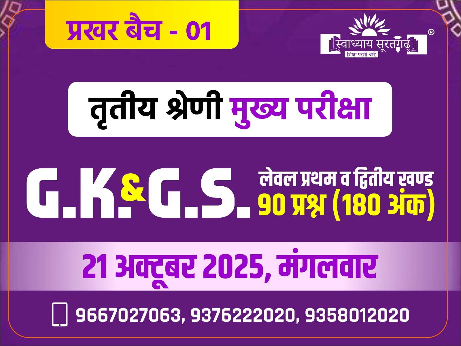 3rd Grade GK New Batch Start ऑनलाइन कोर्स में आपसे जो फीस ली जाएगी वह सिर्फ एक दौहरान यानी एक रिवीजन लगभग 90 दिन की शुल्क ली जाएगी। इस दौहरान(revision) में जो पेपर/PAPER आपको उपलब्ध करवाए जाएंगे उन सभी पेपर की वैधता (validity) लगभग 1 साल (365 day) से अधिक रखी जाएगी। *नियमित छोटे टेस्ट Test Folder तथा मेजर टेस्ट(RPSC पेटर्न पर) Content Section के Test Folder मे उपलब्ध होगा | *टेस्ट का पूर्ण शेड्यूल Overview सेक्शन में उपलब्ध *टेस्ट 7.00 PM निश्चित समय पर Content Section के Test Folder में अपलोड किया जाता है | *1 सप्ताह में 3 यूनिट टेस्ट रहेंगे प्रत्येक यूनिट टेस्ट में लगभग 50 प्रश्न सम्मिलित रहेंगे। प्रश्नों का स्वरूप वस्तुनिष्ठ प्रकार का होगा। **ऑनलाइन में हमने विद्यार्थियों को तीन सुविधाएं उपलब्ध करवाई है।** ➡️ 1. जिसमें आप फोन में ऑनलाइन MCQ अभ्यास कर सकते हैं(बार - बार)। ➡️ 2. आपको पेपर की पीडीएफ उपलब्ध करवाई जाएगी। जिसका आप प्रिंट निकाल सकते हैं अपने फोन में उसको Store कर सकते हैं। ➡️ 3. आपको पेपर की उत्तर कुंजी/ Answer key उपलब्ध करवाई जाएगी जिसका प्रिंट निकलवा सकते हैं और फोन में उसको store कर सकते हैं। *शेड्यूल प्लान में प्रत्येक विषय के टॉपिक दिए गए हैं आप विद्यार्थी इस बात के लिए स्वतंत्र रहेंगे कि संबंधित टॉपिक को आप किसी भी पुस्तक में से अपनी सुविधा अनुसार पढ़ सकते हैं। *प्रत्येक प्रश्न पत्र का निर्माण चयनित व्याख्याताओं के द्वारा ही किया जाता है। *टेस्ट का समय शाम 7.30 बजे *Pdf तथा answer key भी उपलब्ध करवाई जायेगी । *पूर्णतया नए पाठ्यक्रम पर आधारित | एक बार कोर्स ख़रीदने के पश्चात् किसी भी परिस्थिति में फ़ीस वापस नहीं होगी। *टेस्ट सीरीज से सम्बन्धित किसी भी तकनीकी सहायता के लिए 9667027063 से संपर्क कर सकते है । * ऑफलाइन बैच की जानकारी हेतु संपर्क करें - 9376222020