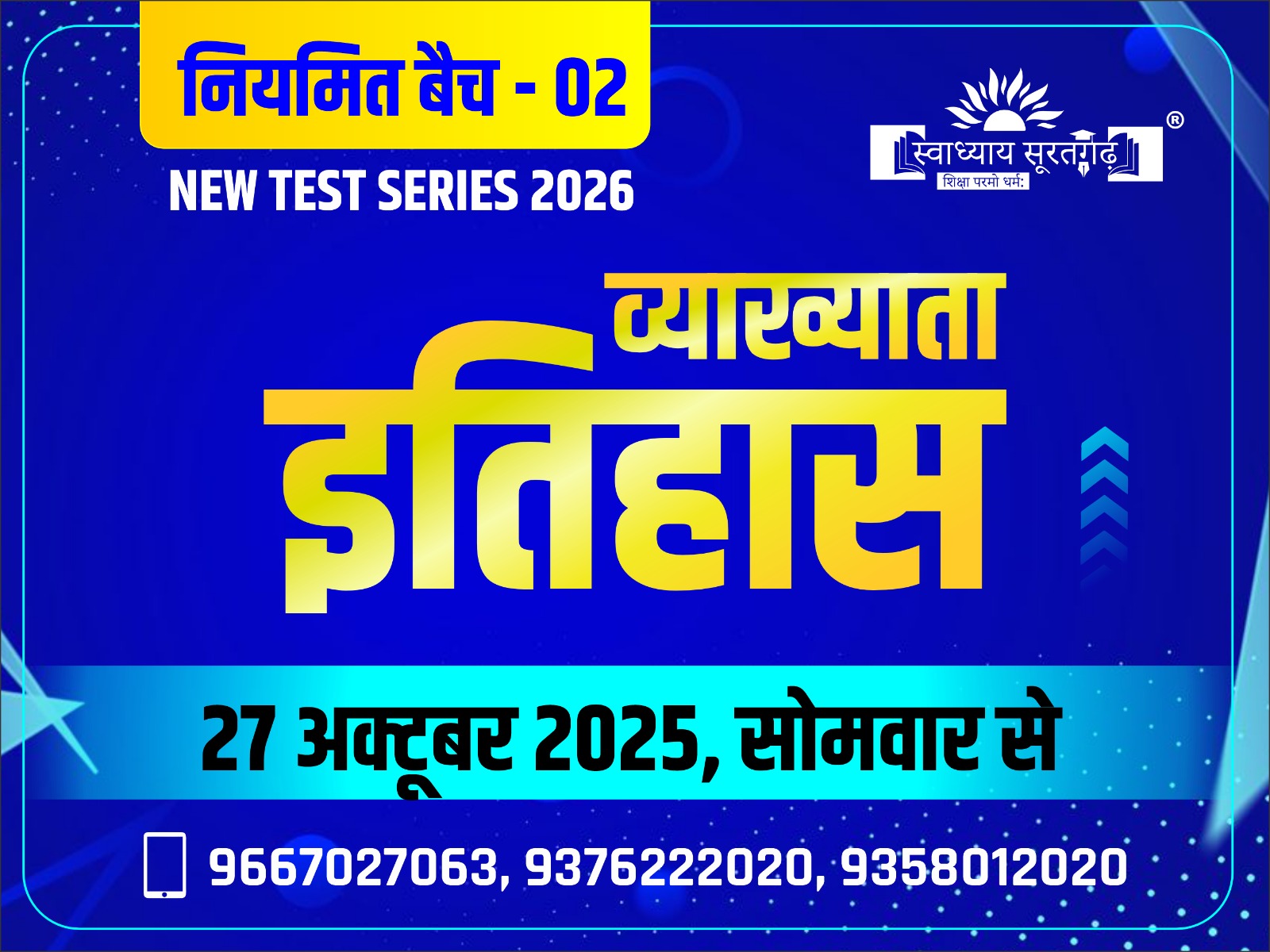 School Lecturer HISTORY New Batch Start ऑनलाइन कोर्स में आपसे जो फीस ली जाएगी वह सिर्फ एक दौहरान यानी एक रिवीजन लगभग 90 दिन की शुल्क ली जाएगी। इस दौहरान(revision) में जो पेपर/PAPER आपको उपलब्ध करवाए जाएंगे उन सभी पेपर की वैधता (validity) लगभग 1 साल (365 day) से अधिक रखी जाएगी। *नियमित छोटे टेस्ट Test Folder तथा मेजर टेस्ट(RPSC पेटर्न पर) Content Section के Test Folder मे उपलब्ध होगा | *टेस्ट का पूर्ण शेड्यूल Overview सेक्शन में उपलब्ध *टेस्ट 7.00 PM निश्चित समय पर Content Section के Test Folder में अपलोड किया जाता है | *1 सप्ताह में 3 यूनिट टेस्ट रहेंगे प्रत्येक यूनिट टेस्ट में लगभग 50 प्रश्न सम्मिलित रहेंगे। प्रश्नों का स्वरूप वस्तुनिष्ठ प्रकार का होगा। **ऑनलाइन में हमने विद्यार्थियों को तीन सुविधाएं उपलब्ध करवाई है।** ➡️ 1. जिसमें आप फोन में ऑनलाइन MCQ अभ्यास कर सकते हैं(बार - बार)। ➡️ 2. आपको पेपर की पीडीएफ उपलब्ध करवाई जाएगी। जिसका आप प्रिंट निकाल सकते हैं अपने फोन में उसको Store कर सकते हैं। ➡️ 3. आपको पेपर की उत्तर कुंजी/ Answer key उपलब्ध करवाई जाएगी जिसका प्रिंट निकलवा सकते हैं और फोन में उसको store कर सकते हैं। *शेड्यूल प्लान में प्रत्येक विषय के टॉपिक दिए गए हैं आप विद्यार्थी इस बात के लिए स्वतंत्र रहेंगे कि संबंधित टॉपिक को आप किसी भी पुस्तक में से अपनी सुविधा अनुसार पढ़ सकते हैं। *प्रत्येक प्रश्न पत्र का निर्माण चयनित व्याख्याताओं के द्वारा ही किया जाता है। *टेस्ट का समय शाम 7 बजे *Pdf तथा answer key भी उपलब्ध करवाई जायेगी । *पूर्णतया नए पाठ्यक्रम पर आधारित | एक बार कोर्स ख़रीदने के पश्चात् किसी भी परिस्थिति में फ़ीस वापस नहीं होगी। *टेस्ट सीरीज से सम्बन्धित किसी भी तकनीकी सहायता के लिए सीताराम शर्मा 9667027063 से संपर्क कर सकते है । * ऑफलाइन बैच की जानकारी हेतु संपर्क करें - 9376222020